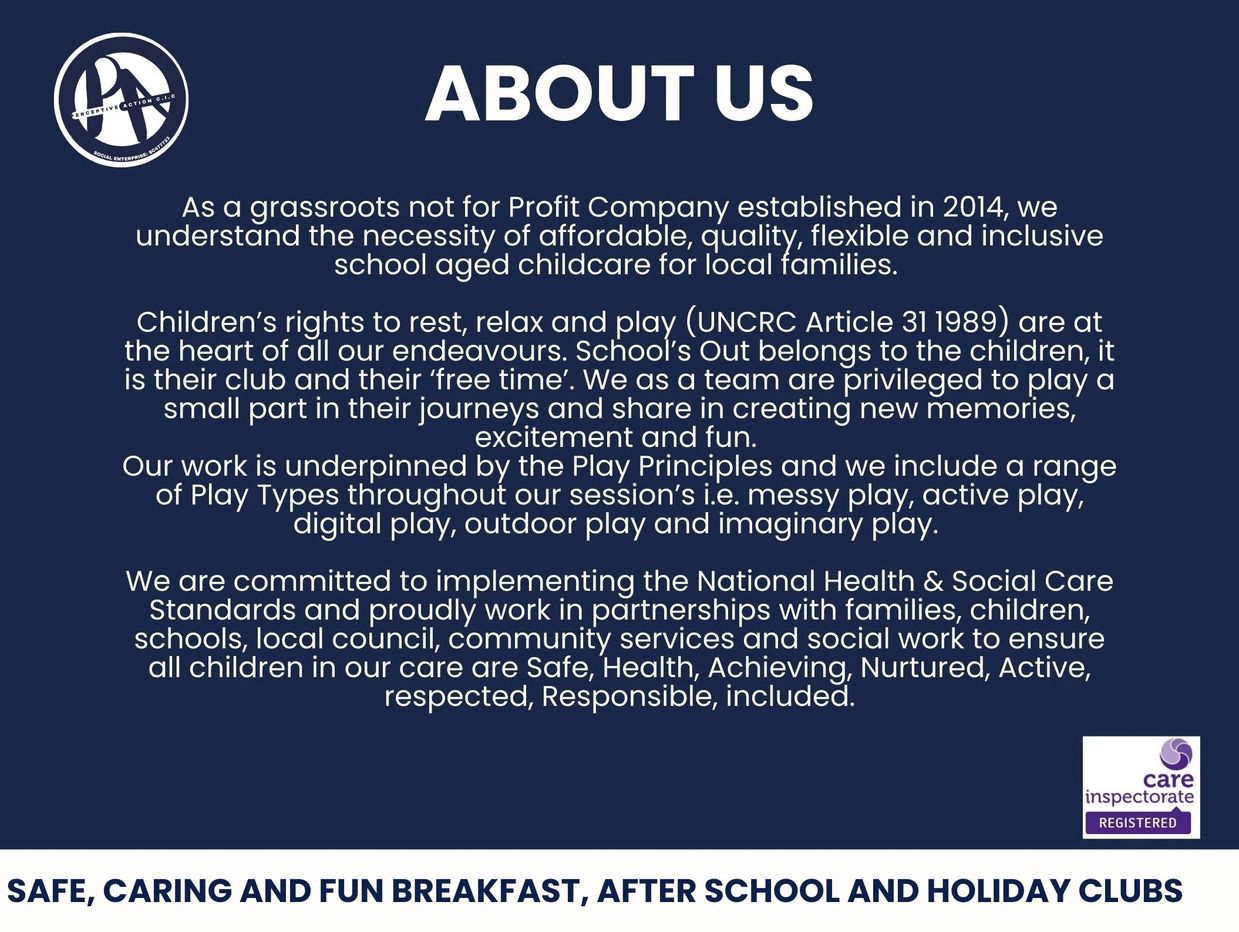 Children are collected from school and escorted back to the club where snack is provided. Followed by child led play and activities planned by observing and listening to children's likes and interests. Activities such as arts & crafts, group games, board games & puzzles, sports, drama, dance, music, outdoor play, sensory fun, local walks and trips to the park and much much more!